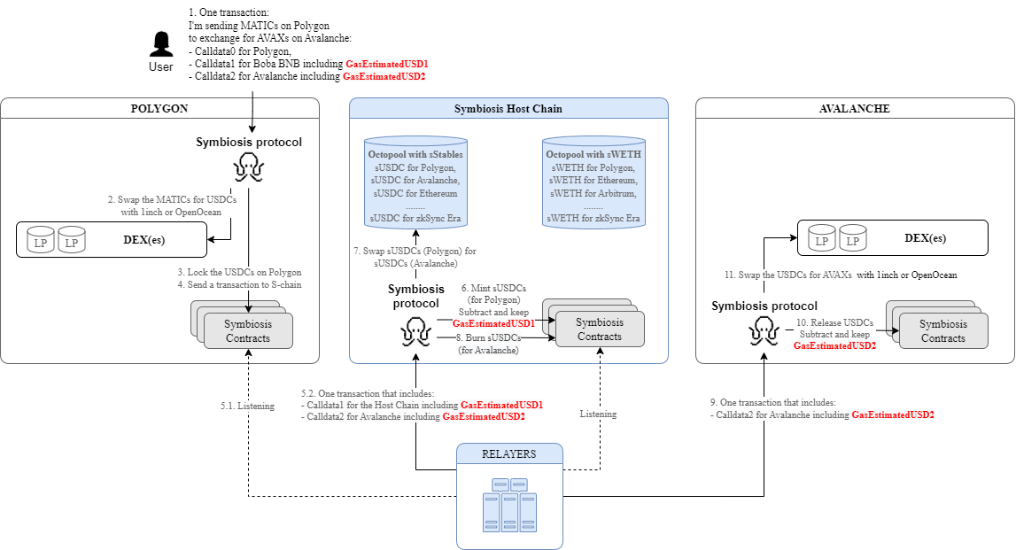 In reality, a cross-chain operation consists of multiple transactions. The Symbiosis protocol executes additional transactions required to complete the swap (*Step 5 and Step 9 in Scheme 1*) and covers the gas fees for processing these transactions.