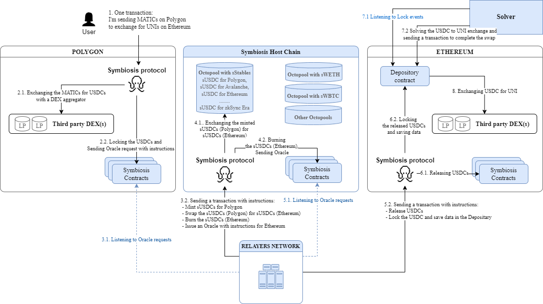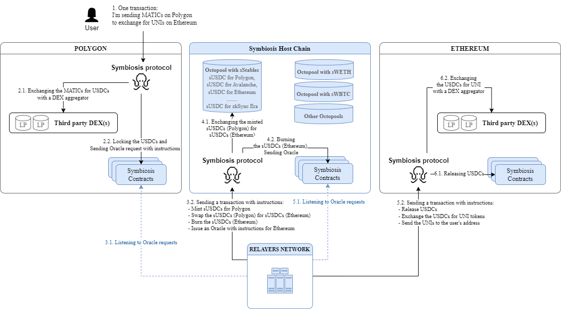 When a user initiates an exchange, the Symbiosis protocol calculates various potential routes, using USDC, WETH, or WBTC as the transit token. The most efficient route is then presented to the user (Step 1). Comprehensive information on Octopools can be found here: [symbiosis-octopools](https://docs.symbiosis.finance/crosschain-liquidity-engine/symbiosis-octopools "mention").